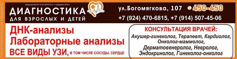 Инновационный медицинский центр "Диагностика" применяет методы современной диагностики аналогов которым нет в Забайкальском крае. Благодаря уникальному новейшему высокотехнологичному оборудованию наши первоклассные специалисты проводят ультразвуковые и иные обследования.